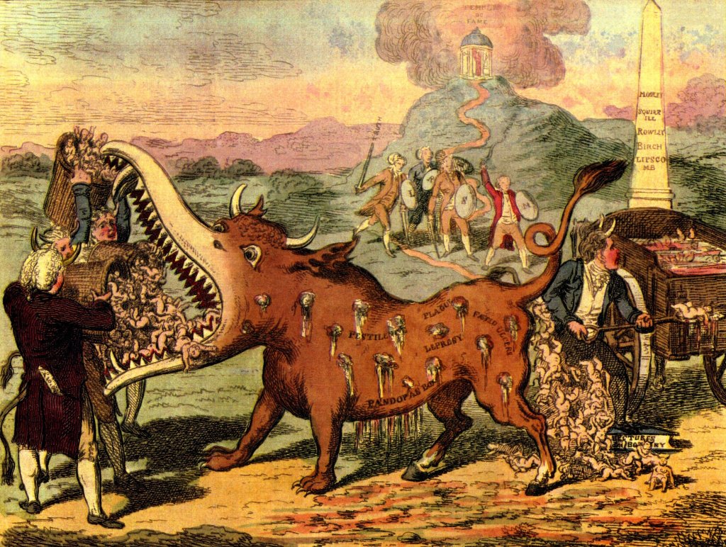 Prima, din 1807, este una în care vaccinul era reprezentat ca un monstru bolnav, asemănător unei vaci, căreia îi erau dați copiii ca hrană, folosită exemplificativ și în articolul celor de la BBC News: „The anti-vaccination movement that gripped Victorian England”