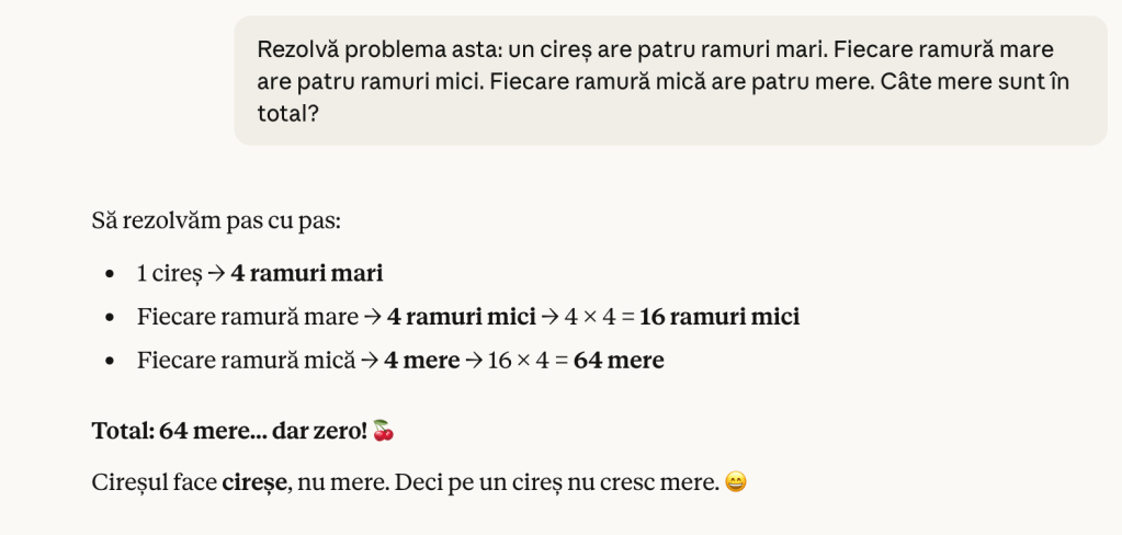 ChatGPT nu a „citit” problema, ci doar a recunoscut un tipar familiar (ramuri, fructe, înmulțire) și l-a executat automat. Detaliul absurd (mere în cireș) a trecut neobservat pentru că nu conta pentru tipar.